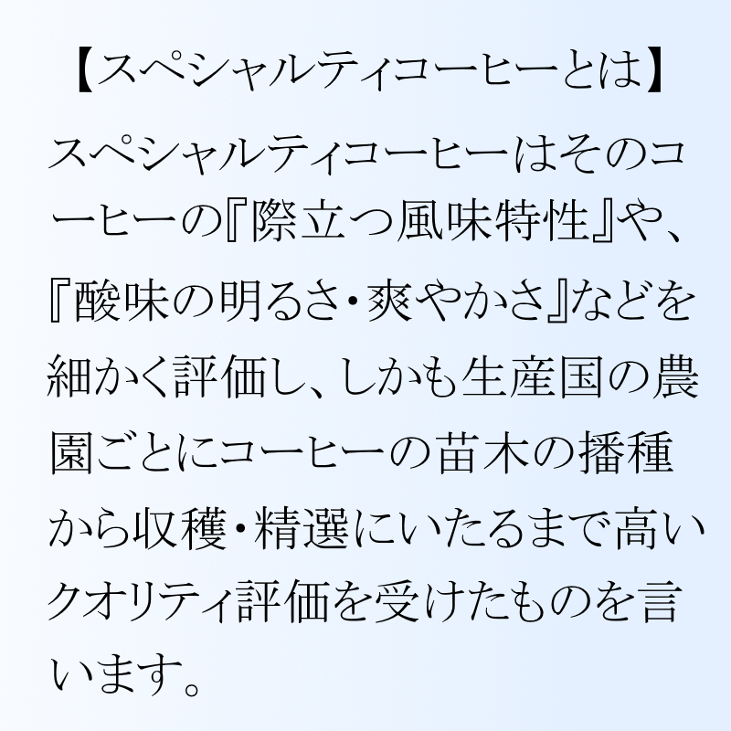 ゲイシャとはコーヒーの原種の「ゲイシャ種」の事です。そしてこのラ・エスメラルダ農園のゲイシャコーヒーはあらゆるオークションでダントツの落札価格を記録しています。その味わいは柑橘類を思わすフレーバーと驚くほどすっきりした甘味を伴った酸味を持ち、飲み終わった後にその余韻を残します。一杯ずつの簡単ドリプバッグにしました。